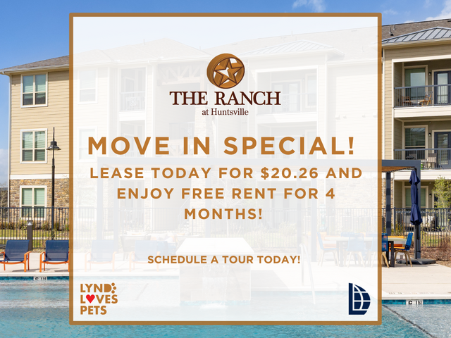 Welcome to Ranch at Huntsville, a residential community featuring one, two, and three-bedroom apartments in Huntsville, TX. Spacious layouts and amenities welcome you home, along with exceptional service and an ideal location within walking distance to shopping, dining, and entertainment options. Are you looking for an apt for rent in Huntsville, TX? Contact our friendly, professional office staff to schedule a tour today.